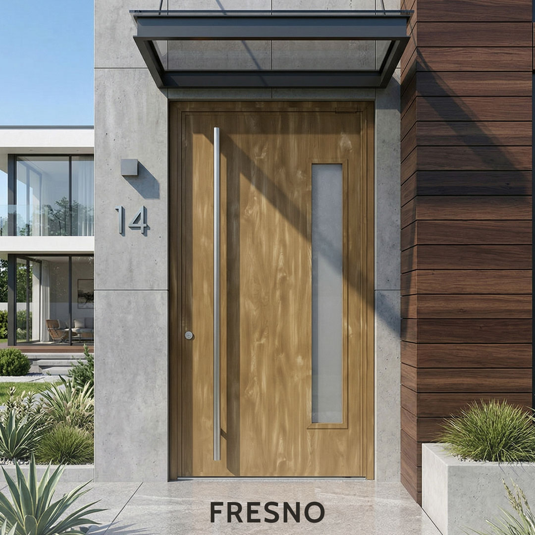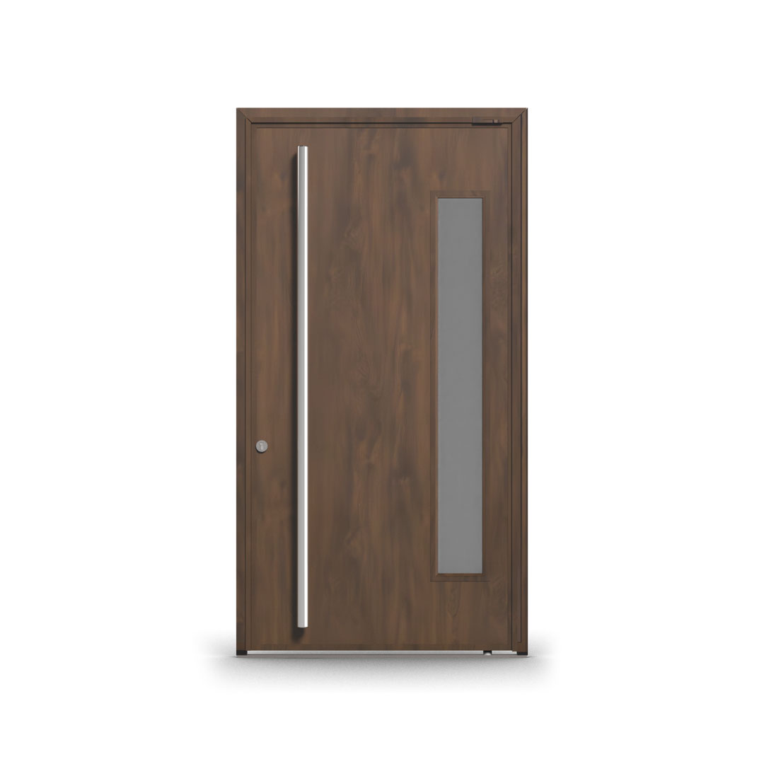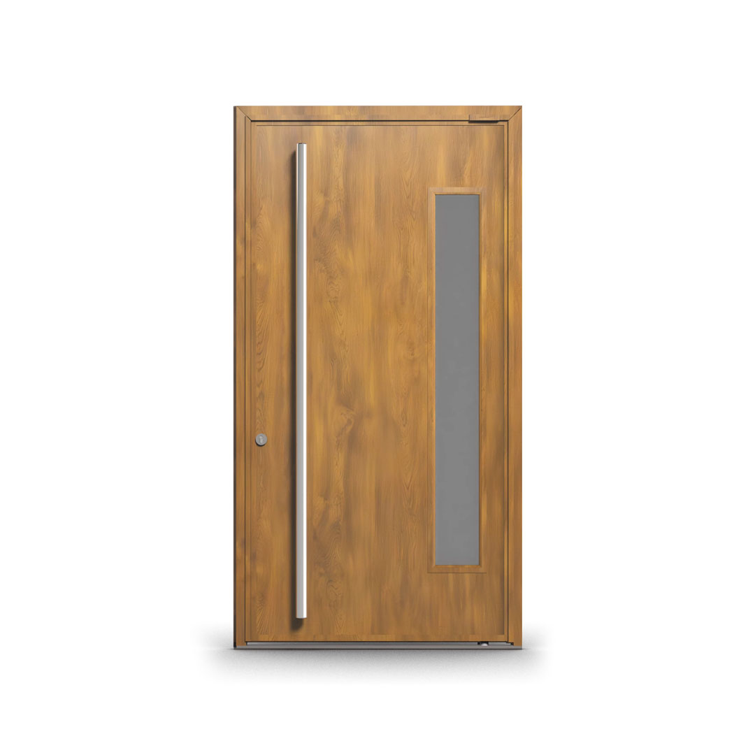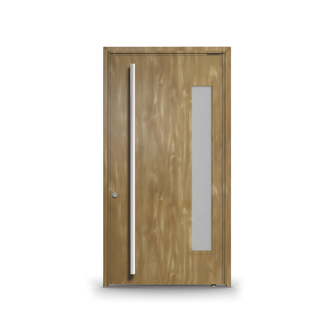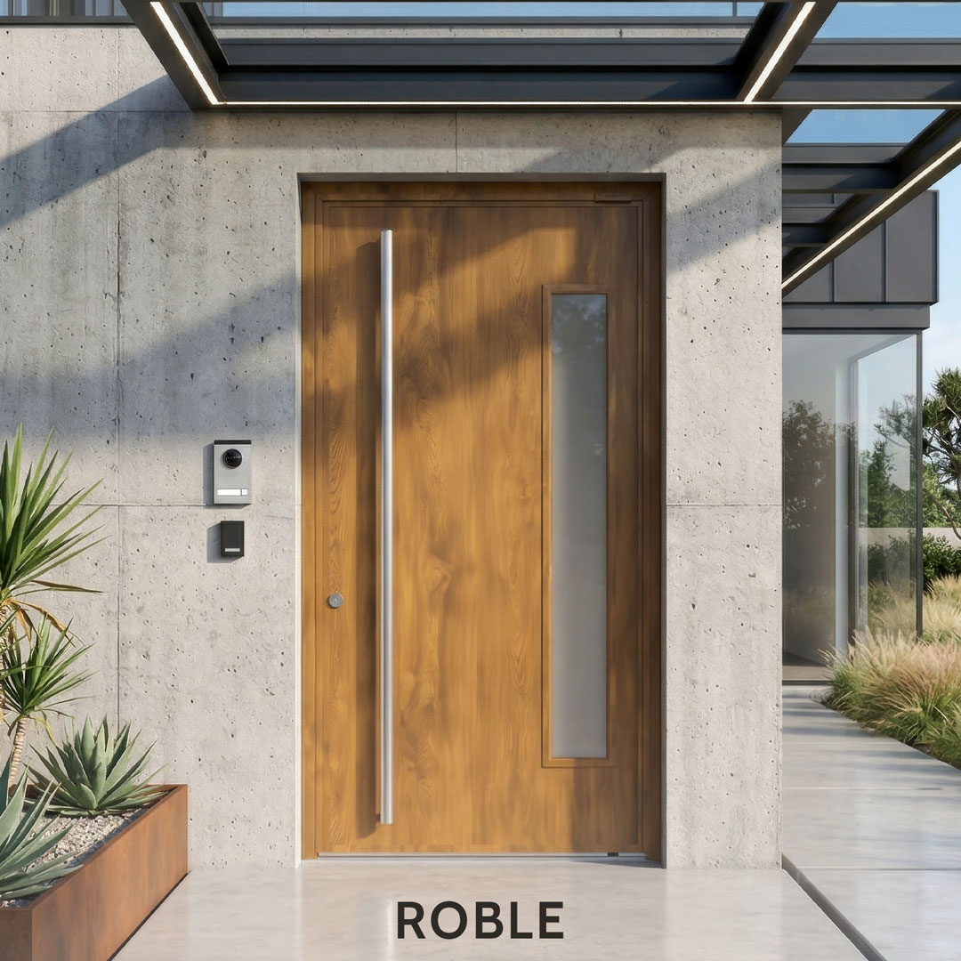 La Puerta Pivotante Foliada Simil Madera PAVIR es una abertura de exterior diseñada para quienes no están dispuestos a elegir entre estética y rendimiento. Combina la calidez visual de la madera con la solidez, la hermeticidad y la protección anticorrosión de una estructura de acero inyectado de primera calidad. Es la puerta que no solo cierra un acceso: define el carácter de una fachada.